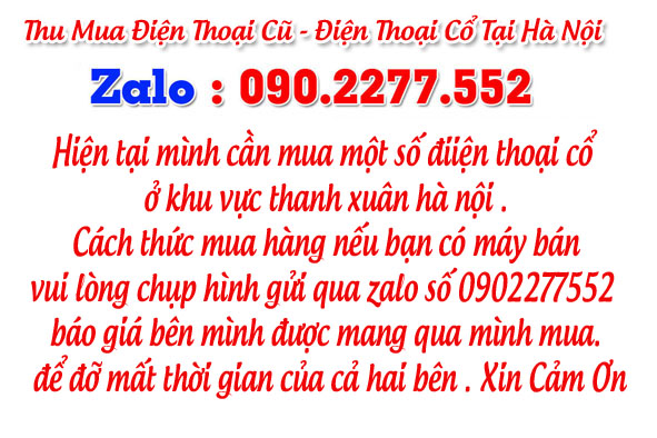 Hiện tại mình cần mua một số điiện thoại cổ ở khu vực thanh xuân hà nội . Cách thức mua hàng nếu bạn có máy bán vui lòng chụp hình gửi qua zalo số 0902277552 báo giá bên mình được mang qua mình mua. để đỡ mất thời gian của cả hai bên . Xin Cảm Ơn